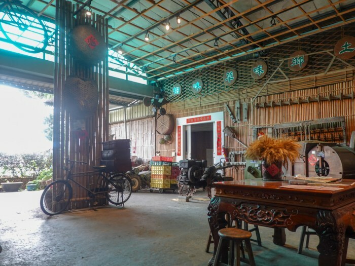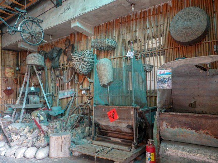 門口處很值得停留走走看看,擺放許多古早味濃厚的物品,像是稻米的風穀機、碾米機各種農園須用機具等,還有蓑衣、鐮刀、酒缸等。