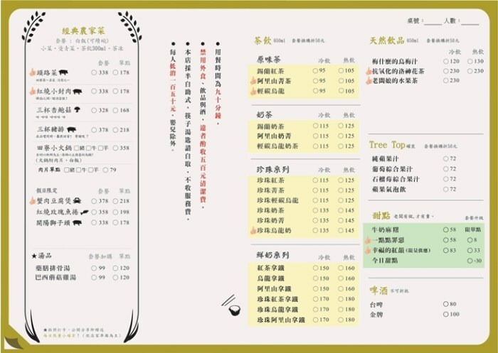 點餐方式可以選擇套餐,包含白飯(可續碗)、燙青菜、小菜、茶飲300ml以及茶凍。也能夠單點,其中若有點套餐,飲料可以換購折50、甜點的部分可以升級補差額。除了嬰兒以外每個人的低消都是150元。