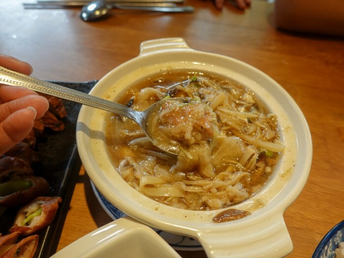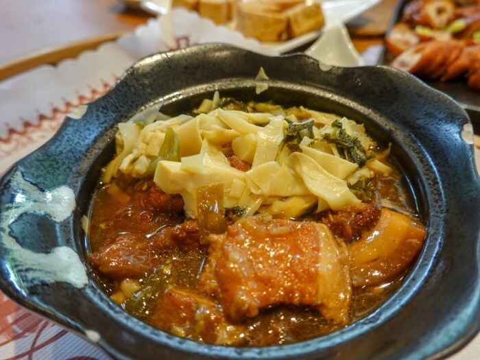 既然要到這裡來品嘗道地的桌菜,早餐一直不敢吃得太飽。想把胃口留給經典菜色。飢腸轆轆的狀態下翻開菜單每一道都好想點,尤其是「紅燒封肉」,油亮的外皮加上爽脆的筍絲,實在是相當下飯呢!