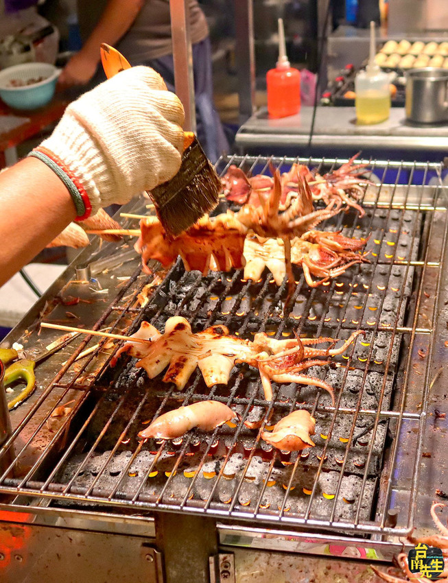 夜市限定限量供應晚來吃不到的烤魷魚,產地新鮮直送,搭配獨家特調鹹甜醬汁,還有自行調配的中藥胡椒鹽,現點現烤經常一擺攤就排隊