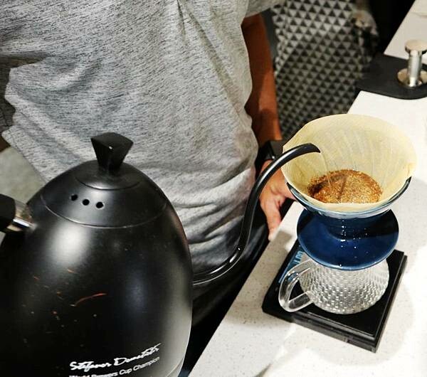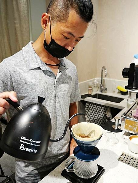 老闆研磨後,以手沖先繞圈,後直沖,避免喝到咖啡的苦澀