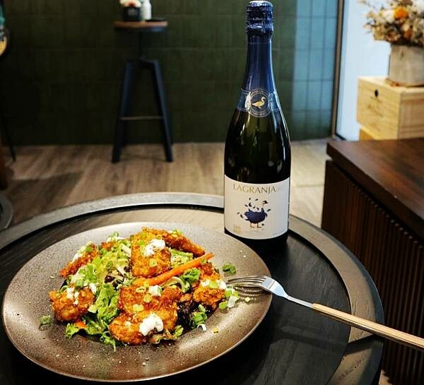 以多種辛香料先醃後烤,鮮甜中帶有淡淡孜然味,鮮蔬沙拉,淋上少許特調沙拉醬,吃起來酸甜、清爽,是很讚的開胃菜、下酒菜(這裡也有品酒、賣酒)