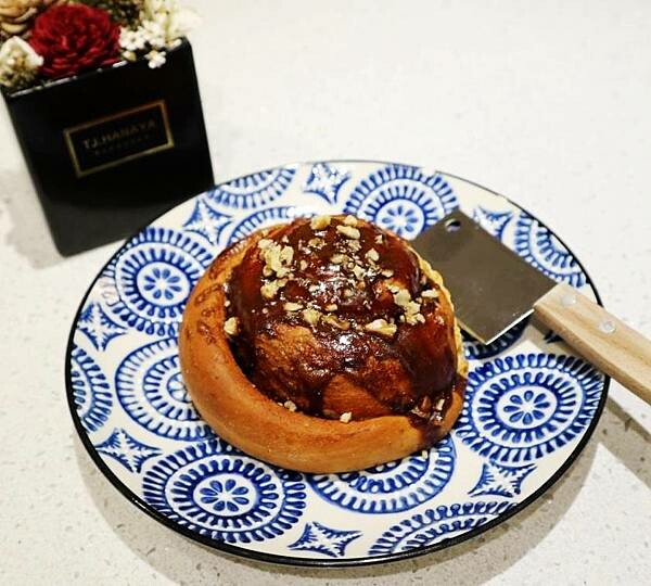 人氣必點-重度肉桂捲,溫熱上場,散發濃郁的肉桂香氣,表面佈滿巧克力、杏仁片,我用附的小刀切開來吃,口感外微酥、內軟彈