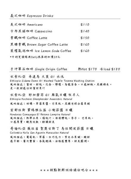 店內供應手沖單品咖啡、義式咖啡、茶、特調飲品、鹹食餐點、輕食、甜點(每日手工現做,洽詢吧台),聽老闆說店內採用的西式軟法,可是全台北最好吃的!