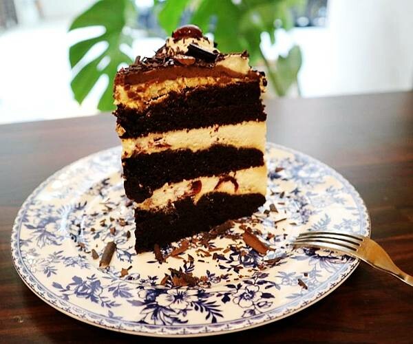 人氣必點-濃鬱黑森林蛋糕,口感冰涼濕潤、扎實,有著淡淡酒味及濃厚的奶味、巧克力味,彷彿吃了一整塊甜巧克力,卻不膩口,很能滿足甜點控