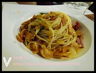 培根切得很小,麵條軟硬適中,炸蒜片拌上醬汁配上輕微辣度,整體口味搭配和諧