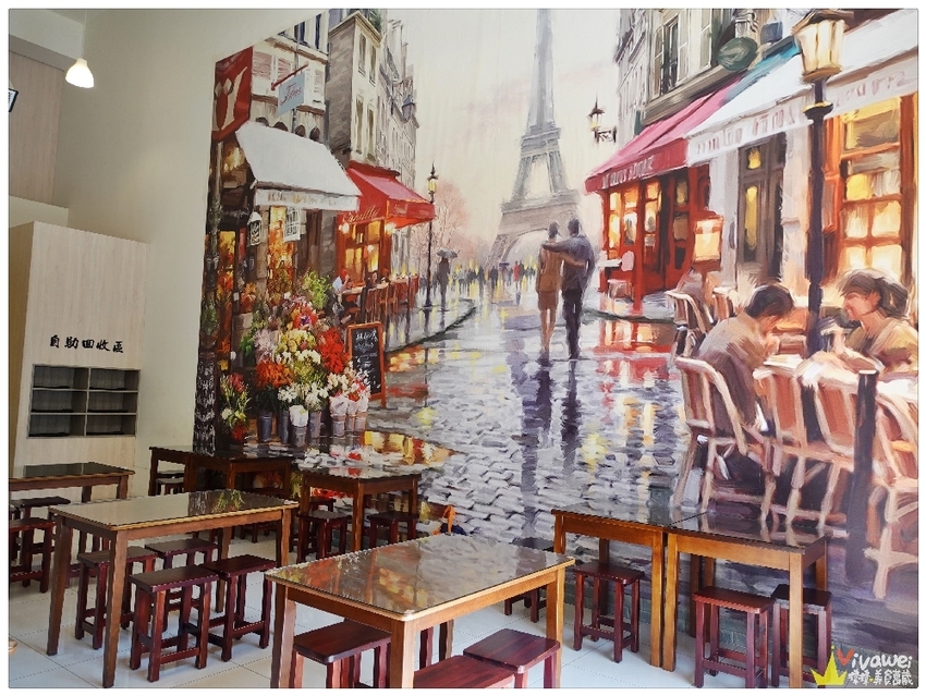 ▲內用環境乾淨明亮,挑高的空間,用餐起來沒有壓迫感,而牆面上有法國巴黎街景的壁畫,歐風的裝潢讓用餐多了幾分優雅感!
