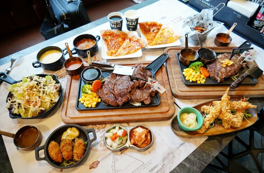 ▼牛排上頭還看得見直火燒烤的烙痕,一旁搭配玉米、花椰菜、紅蘿蔔,底層還有洋蔥,都可以搭配享用!最特別的是隨餐附有日本進口的鑄鐵石塊,高溫達到350度,讓大家可以自行調整熟度,如果冷卻了也可以請服務人員送回廚房加熱!