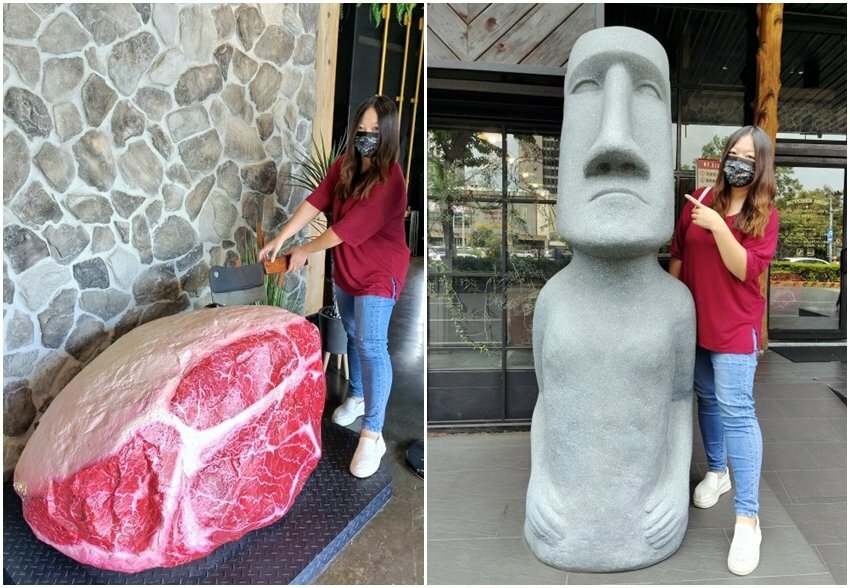 ▼門口的摩艾石像也超好拍,站在旁邊人都變小隻啦!一進到店內也會看到這塊超大的牛排石,上頭還插著一根菜刀,很適合來拍個網美照!