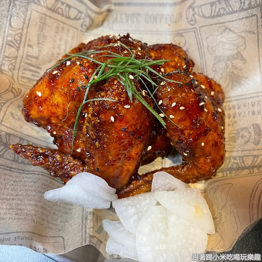 韓式炸雞(辣味)158元,一份有四隻完整的三節雞翅膀,帶點微微的辣味又有酸甜的醬汁有入味到,嫩嫩的雞翅多汁很推唷!