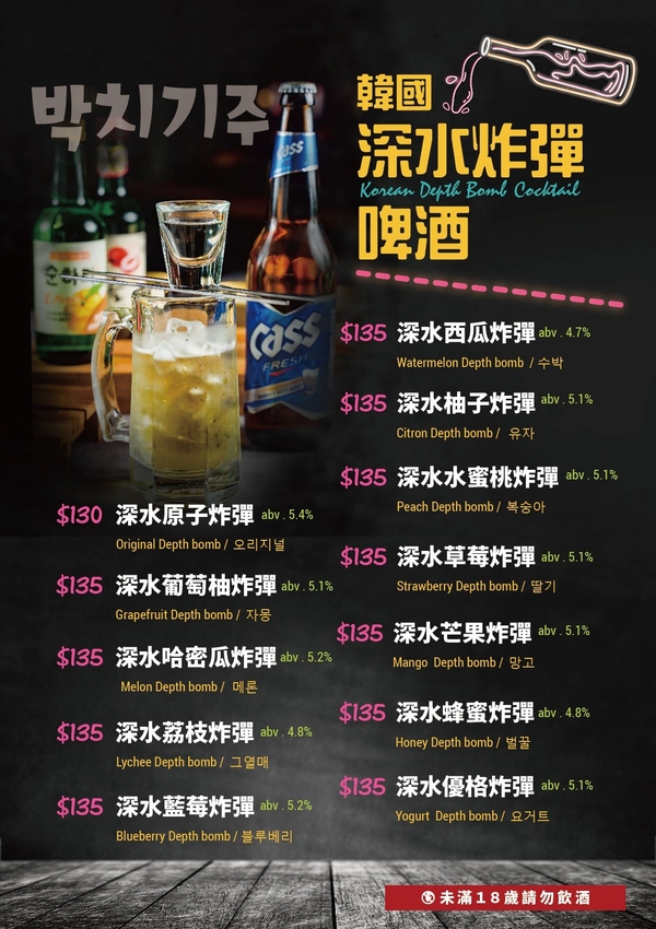 深水炸彈(統一價135元),多達12種風味的燒酒配cass啤酒,這可是老饕必點,越喝越HIGH