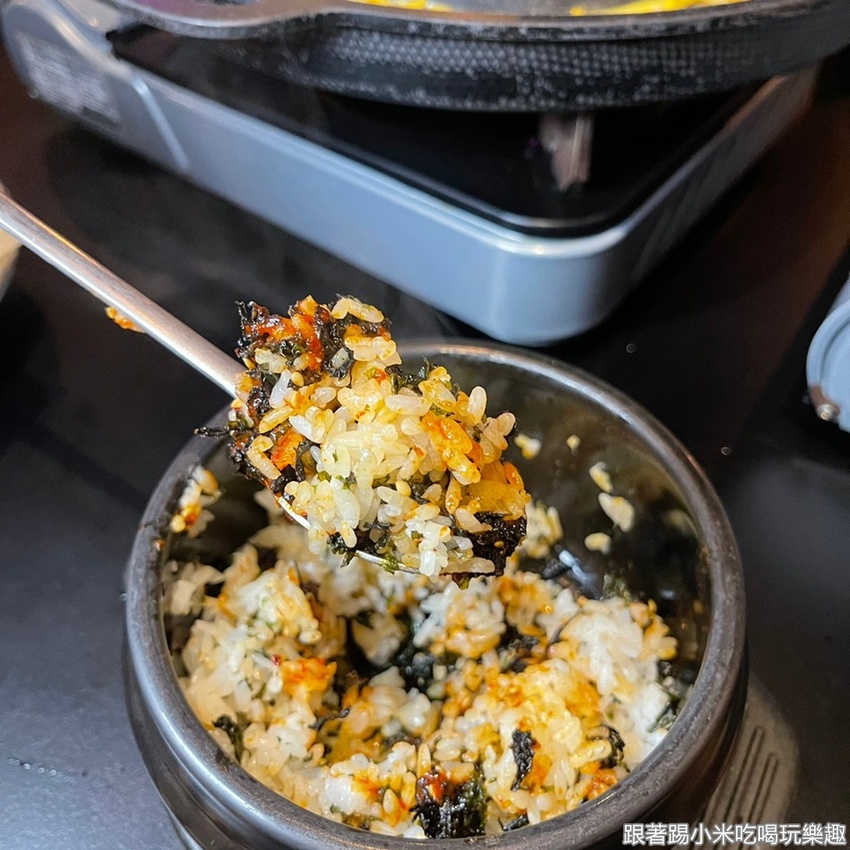 石鍋飯有海苔酥、麻油及拌飯醬,食用前攪拌一下可是香氣四溢,跟豆腐鍋一起吃就是道地的韓國湯泡飯
