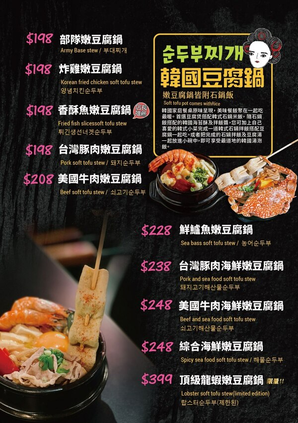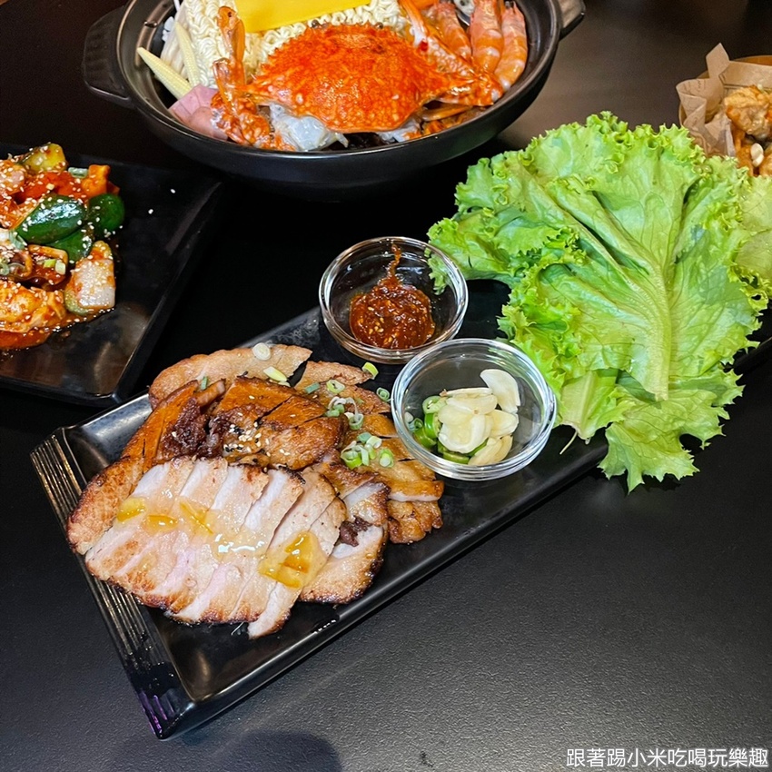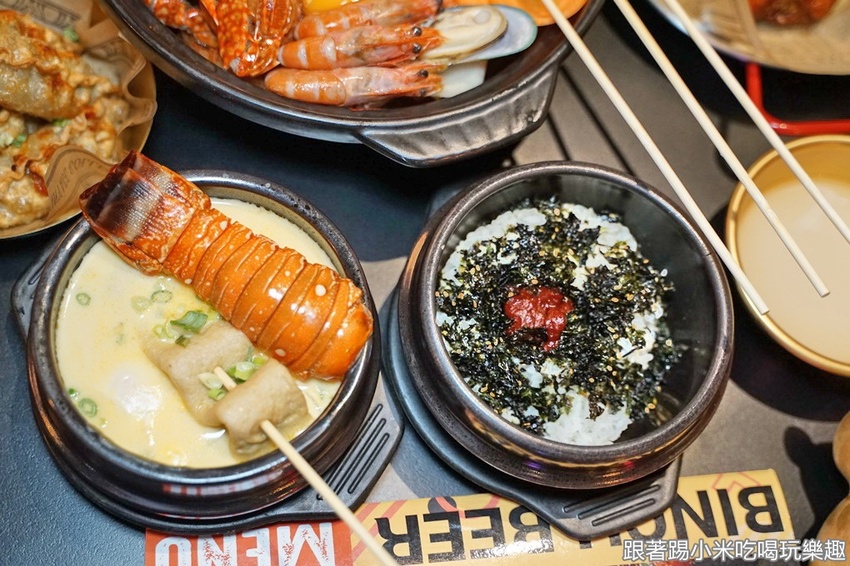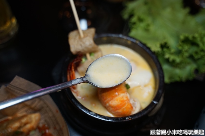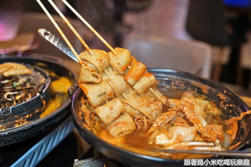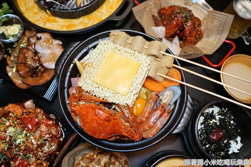 一大鍋超多料,裡面有培根、香腸、罐頭肉、螃蟹、蝦子、淡菜、高麗菜、泡菜韓國魚板及混合了辣椒醬的拉麵米糕,可以讓大家吃過癮!
