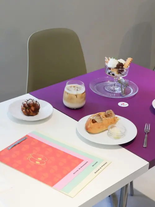 風味可頌外表以紅麴點綴染色裡面擠滿卡士達醬是下午茶的最佳選擇,搭配一杯比利時蓮花餅乾拿鐵更完美。(比利時蓮花餅乾拿鐵-期間限定)
