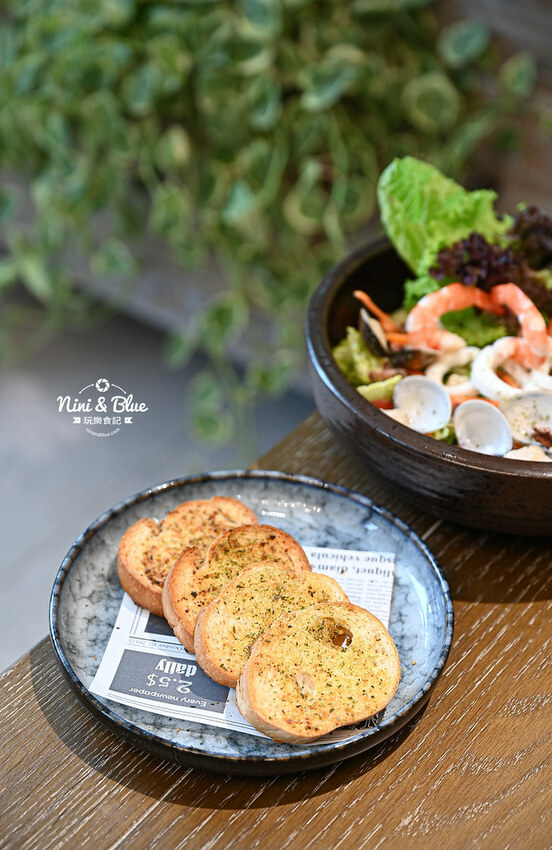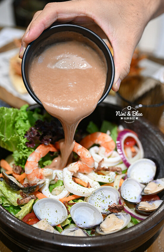 生菜種類豐富,搭配的海鮮有蝦子、透抽、蛤蠣,大量新鮮葉菜,之前外帶6折的時候我們選的葡萄柚優格醬很讓我們喜歡,這次換成梅子醬,有著話梅鹹酸甜味,更特別的是沙拉中,原以為是培根脆片的居然是話梅絲,咀嚼時突然被酸了一下~哈哈哈。