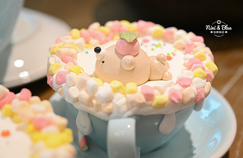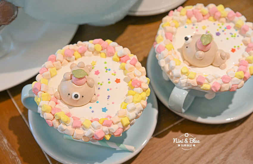 杯緣用繽紛棉花糖和糖霜繞成一圈,黑糖牛奶上面漂浮著店家手做的可愛馬林糖熊熊~超萌的熊熊造型,讓人很捨不得吃!!