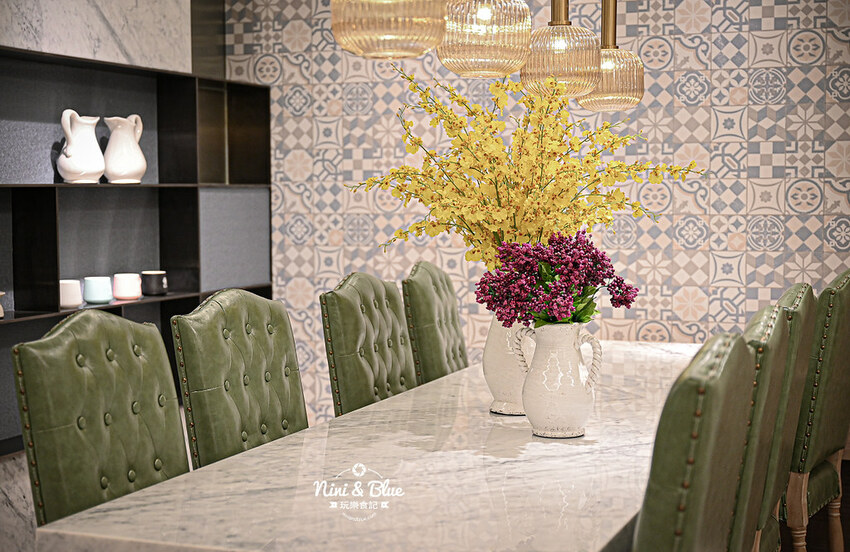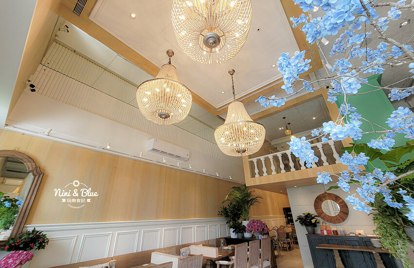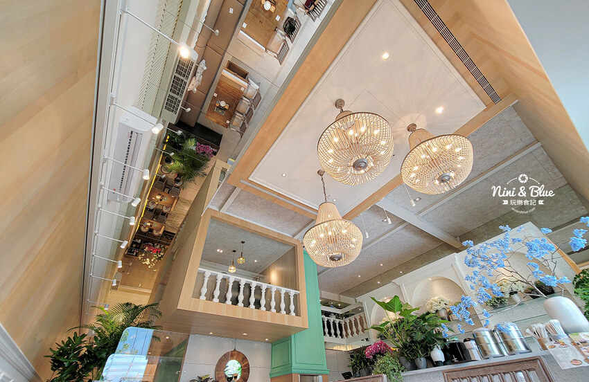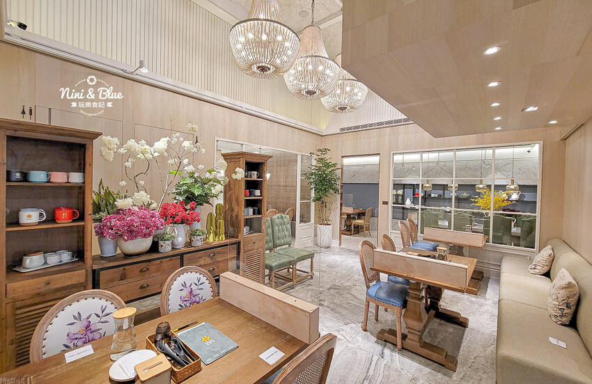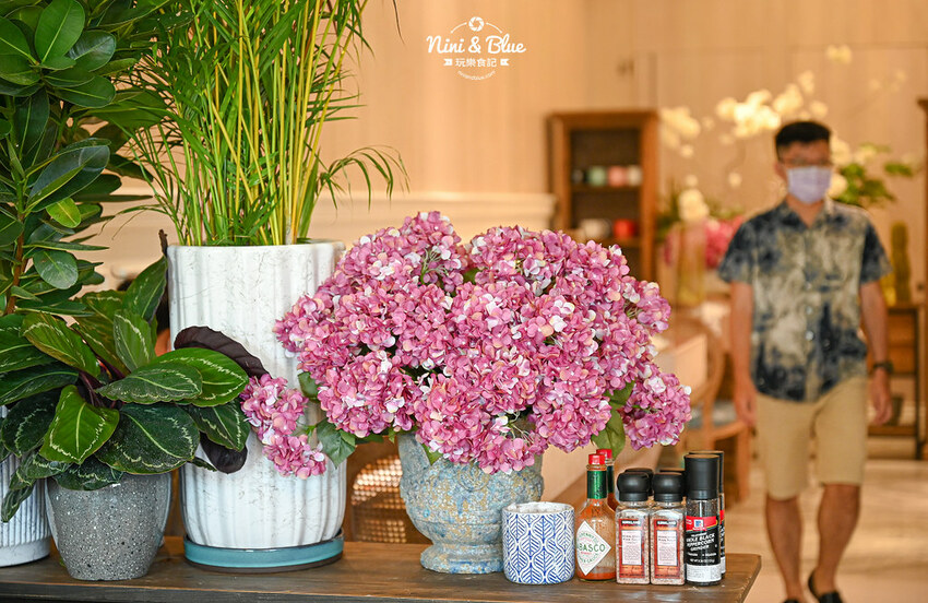 一走進店內挑高的前廳,以木質系桌椅與沉穩石材,配以大量的綠色植栽與花藝營造的舒適的森林系氛圍