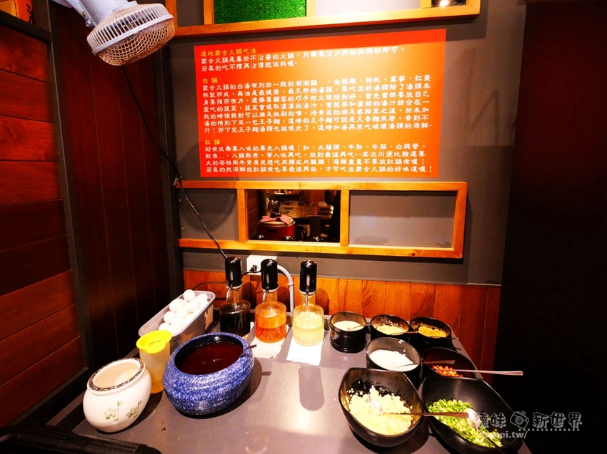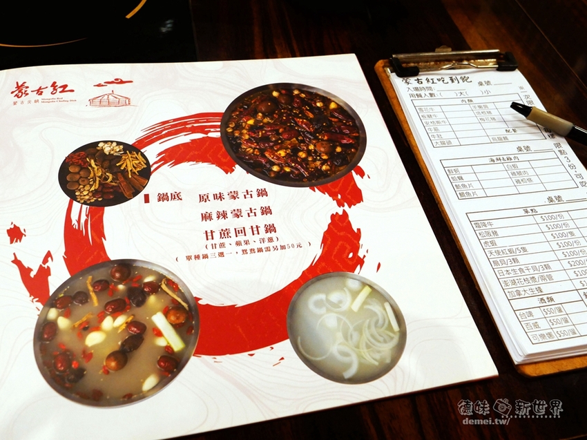 - 鍋底:原味蒙古鍋/麻辣蒙古鍋/甘蔗回甘