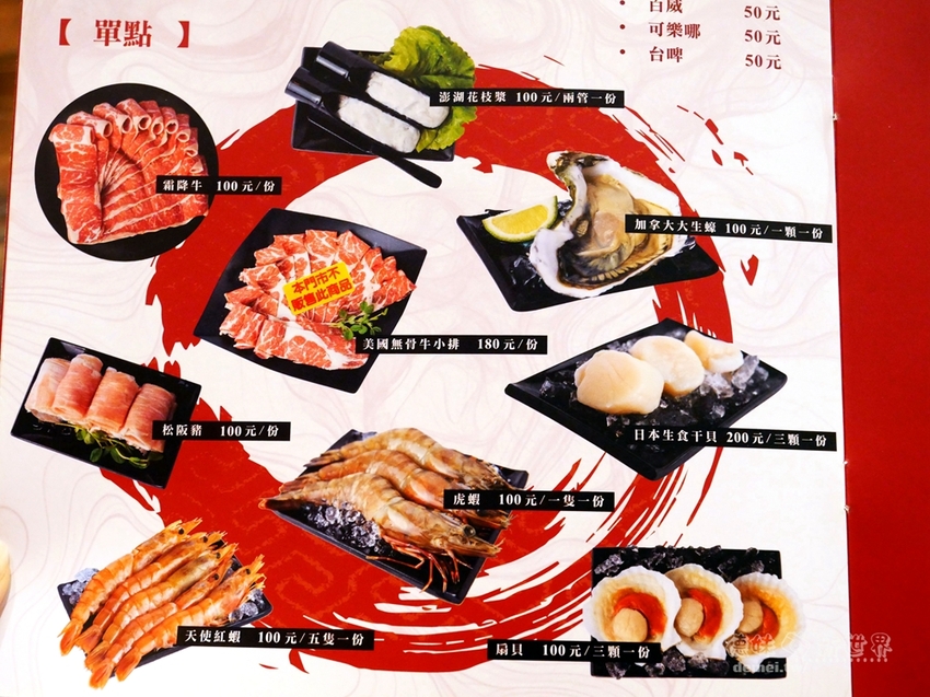 酒類與額外較高檔的肉品、生蠔、干貝等海鮮食材可單點。