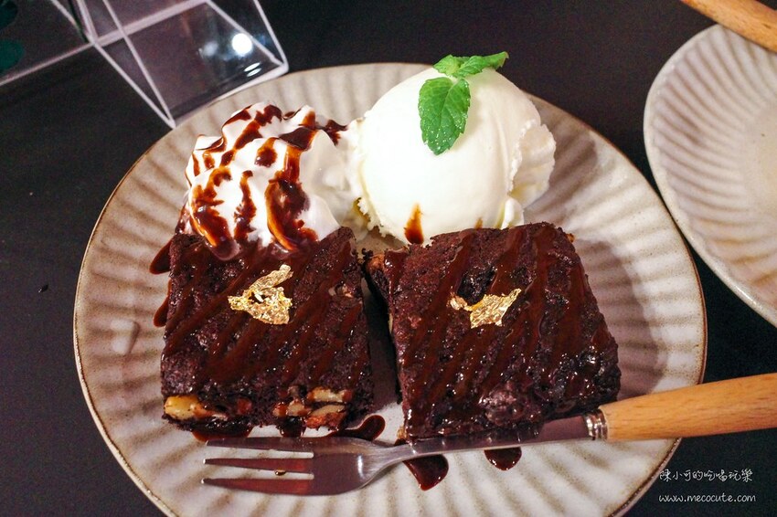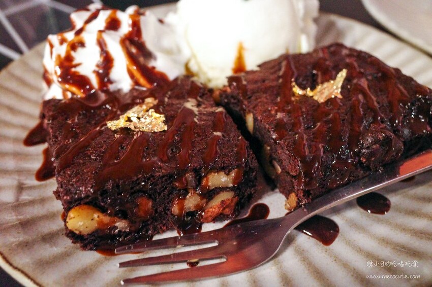 兩塊方型核桃布朗尼,旁邊還有奶油擠花和一球香草冰淇淋,這樣一份60元而已,真心覺得愛吃巧克力的可以點兩份啦!