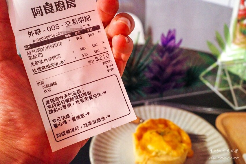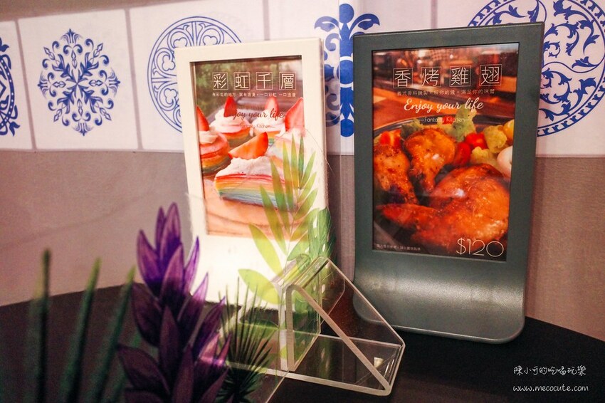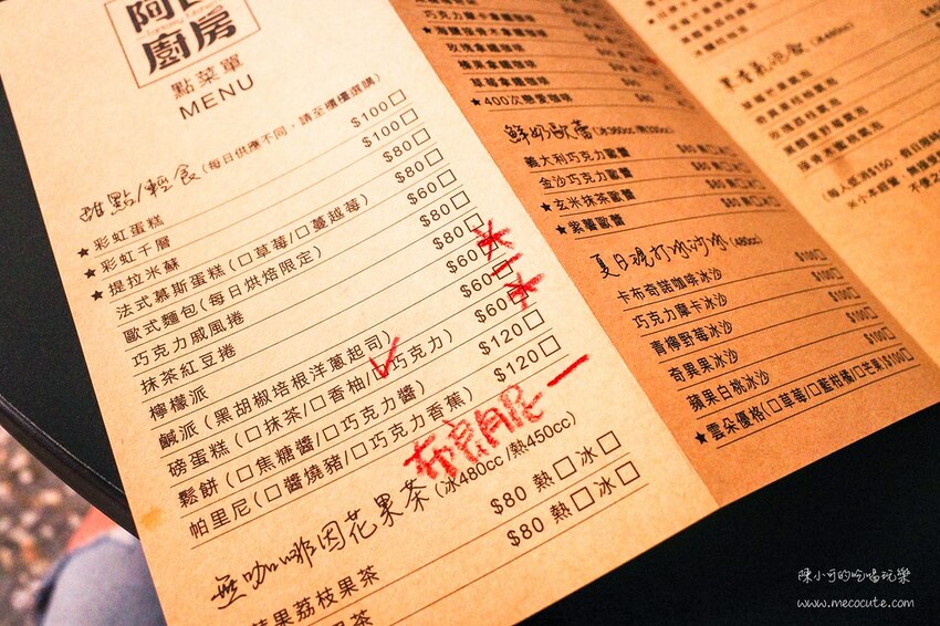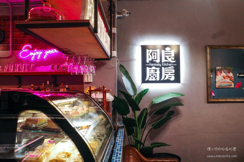 店門口立牌放了阿良廚房的招牌推薦,彩虹千層蛋糕、鹹派和布朗尼看起來都相當吸引人。