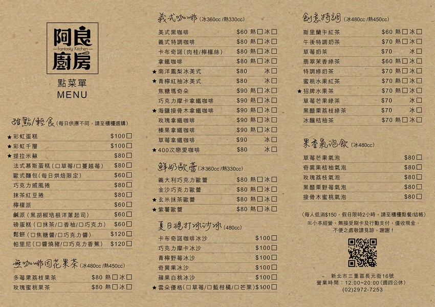 從『阿良廚房』粉絲團抓來的菜單,提供甜食、鹹食、鬆餅、帕里尼等等餐點,飲料有花果茶、冰沙、歐蕾、咖啡、創意特調和氣泡水。