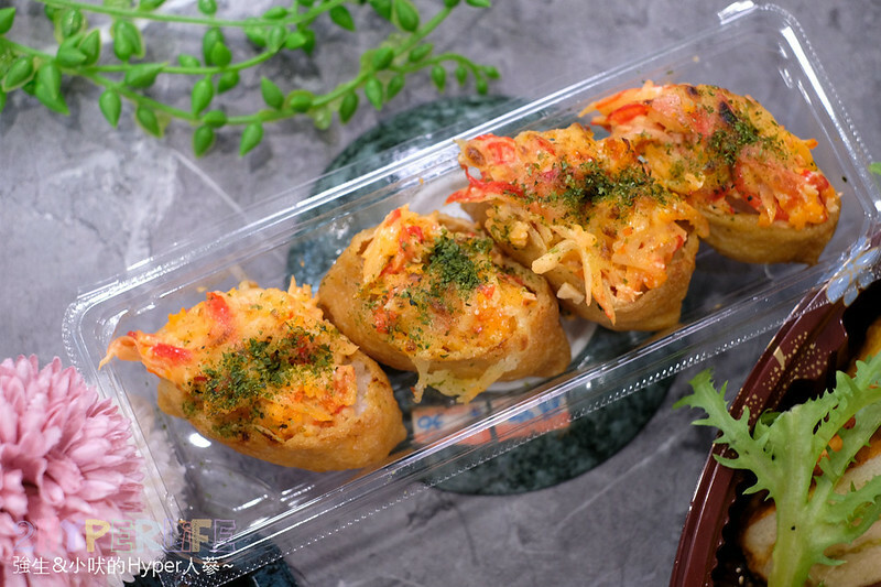 這個豆皮壽司,上面是用烤過的龍蝦肉以及蟹肉一起和沙拉攪拌,上面也有起司。整體吃起來很像pizza口味的豆皮壽司