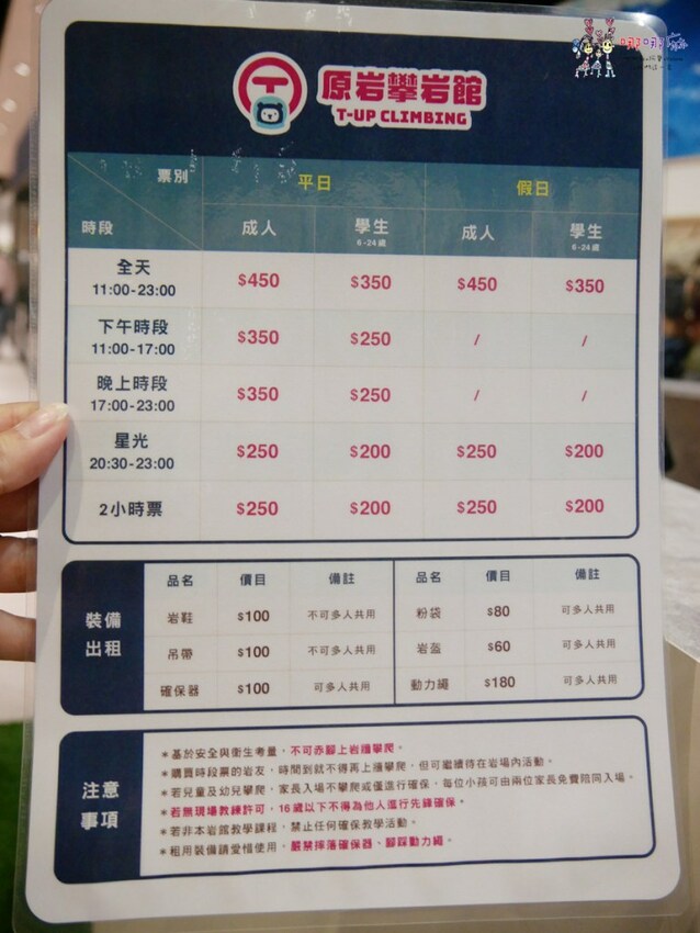 原岩攀岩館價格如下,這不包含教練費用,上攀雙人組體驗課 2hr(含教學 1hr+自由上攀 1hr)價格為1,200 元 。