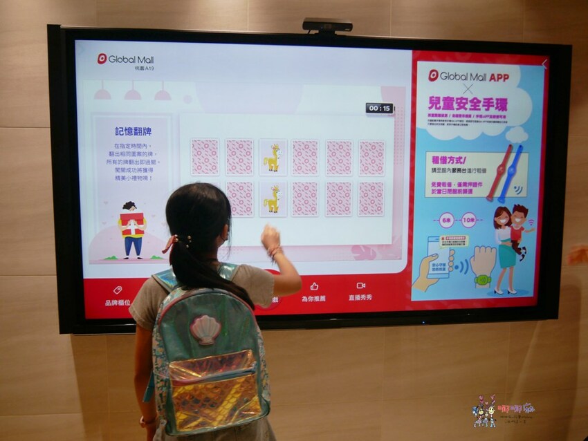 Global Mall環球桃園A19內各樓層都設有互動式智能看板,提供餐廳訂位、線上購物、互動遊戲、直播秀秀、商品推薦等功能,剛剛的直播間在直播時也會同步放映到看板上,讓各樓層的人都可以看到。還有部分餐廳的預約訂位功能,這樣大家就不用一定要到餐廳才能訂位,非常的方便。