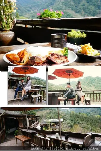 戶外有傘架的座位區,還有草地可以跑跑,一旁就是美麗的山景