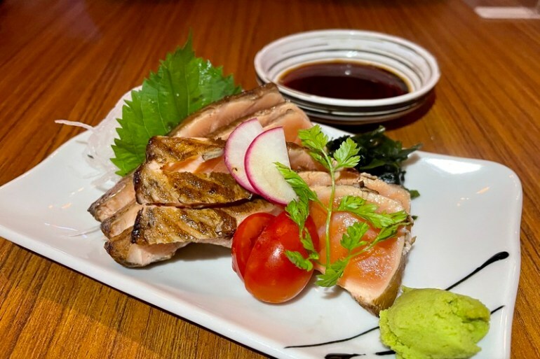 站在第一現場觀看師傅燒製稻草燒的過程,有機稻草的燻香撲鼻,猛烈的大火炙燒整塊鮭魚生魚片,帶來絕佳的視覺刺激。稻草燒分為單一魚種與特盛(可以任選兩種魚類)。除了鮭魚外,紅甘、鰹魚也是常態性的生魚選擇。