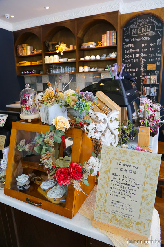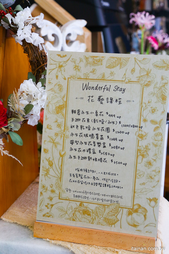 「度時光Wonderful Stay」的闆娘因為擁有許多花藝設計師的執照,因此除了提供餐點外,也提供花藝設計、花禮、生活花藝課程等,若想挑個花禮送人可客製化訂做,喜歡玩玩花藝設計的朋友也可以預約報名花藝課程,一人就開班唷!