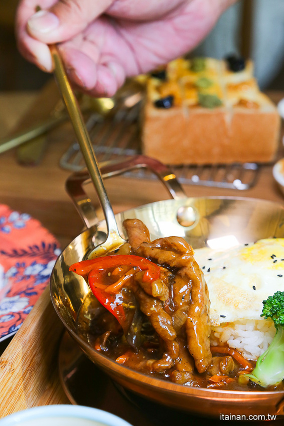 黑胡椒牛柳燴飯飯量滿多的,感覺女生吃會有點太多,不過他們的米飯吃起來很Q,黑胡椒牛柳也很嫩口入味。另外在餐具的選用上也很用心,用古銅色的盤子裝盛看起來就質感滿分而且還帶點復古的貴族風,很讓人喜歡。