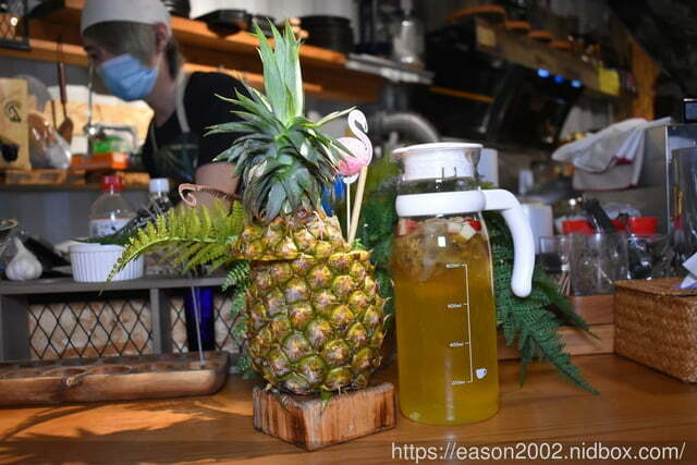 這裡的飲品,不但有特色調酒,另外,也有無酒精飲品,我們點了一個椰&季節果茶,椰是所有調酒裡面最特別的,鳳梨造型已經是吸睛焦點,更厲害的是,#飲居將調酒加入椰奶,打成冰沙,利用鳳梨做調酒冰沙的容器,不僅好拍,更是頗具特色的一杯調酒。季節果茶,除了融入一般的新鮮現切水果,更結合玫瑰花茶為基底,店家提供的是熱飲,也可以另外跟服務人員拿冰塊。