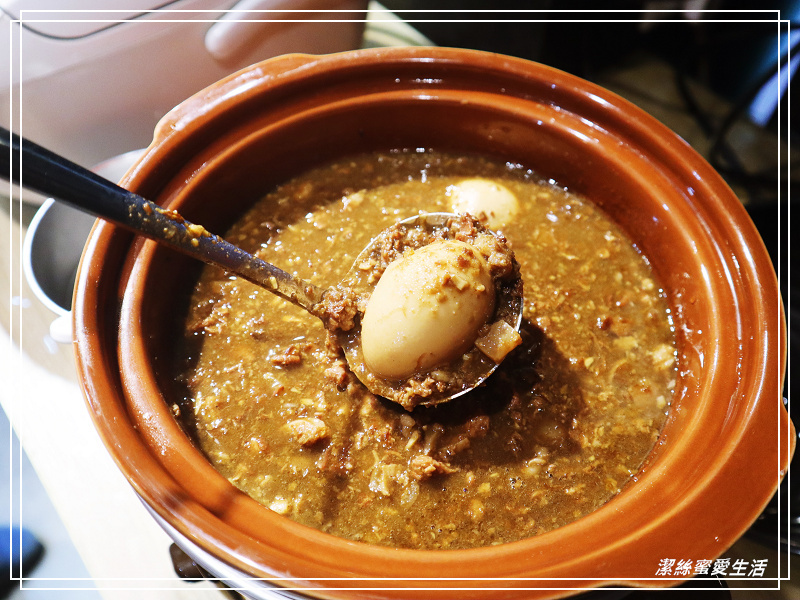 雖然我個人是不建議把肚子用滷肉飯塞飽XD,但如果真的無飯不歡,這鍋應該也會滿意——竟然還有整顆滷蛋是怎樣😂😂,而且肉燥也是滿滿的,不是只有單薄的稀肉汁,如果單看這張照片,還會以為是哪家小吃店的滷肉鍋呢。