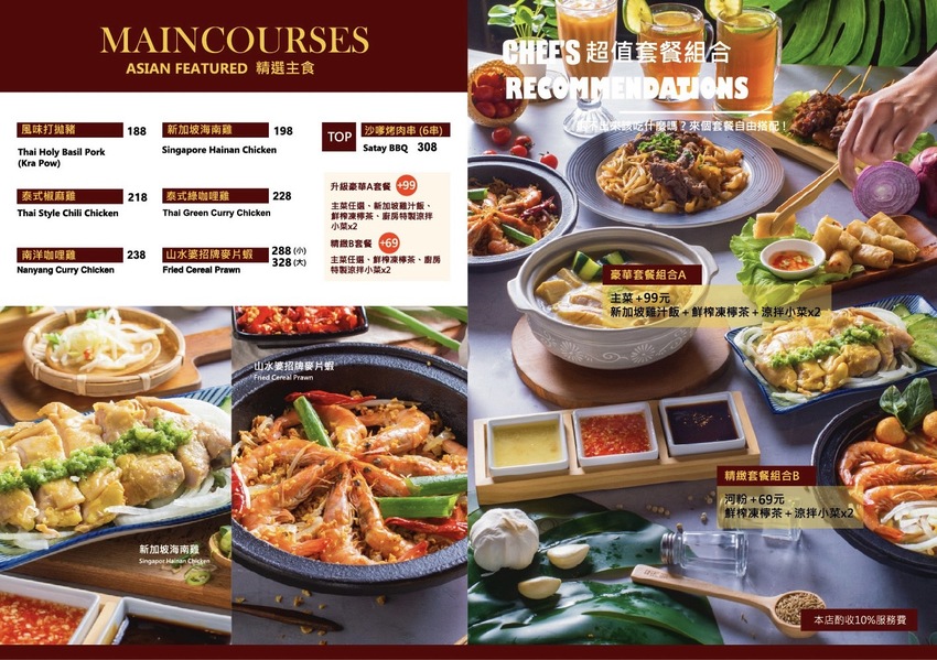 從菜單品項就能感受出濃濃的南洋色彩,從新加坡肉骨茶到泰式椒麻雞都能吃到,更有許多小菜和飲品選項可以點選,也能加價升級成豐盛的套餐組合,價位在百貨內來說也算是合理。