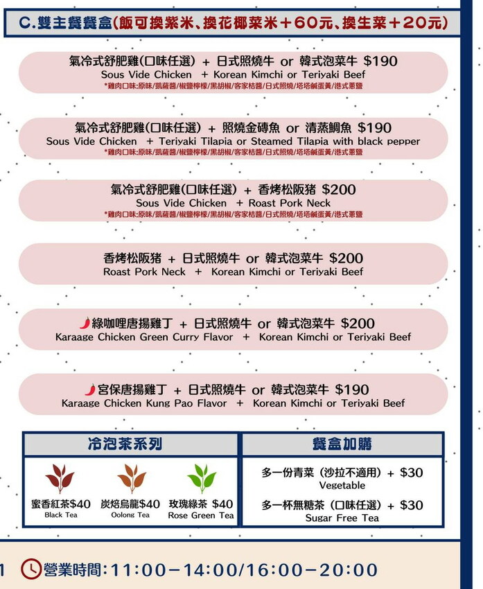 店內暫時沒有開放內用,在疫情期間先以外帶為主,日後有開放內用時不妨可以來這裡吹吹冷氣吃個健康餐盒很愜意~