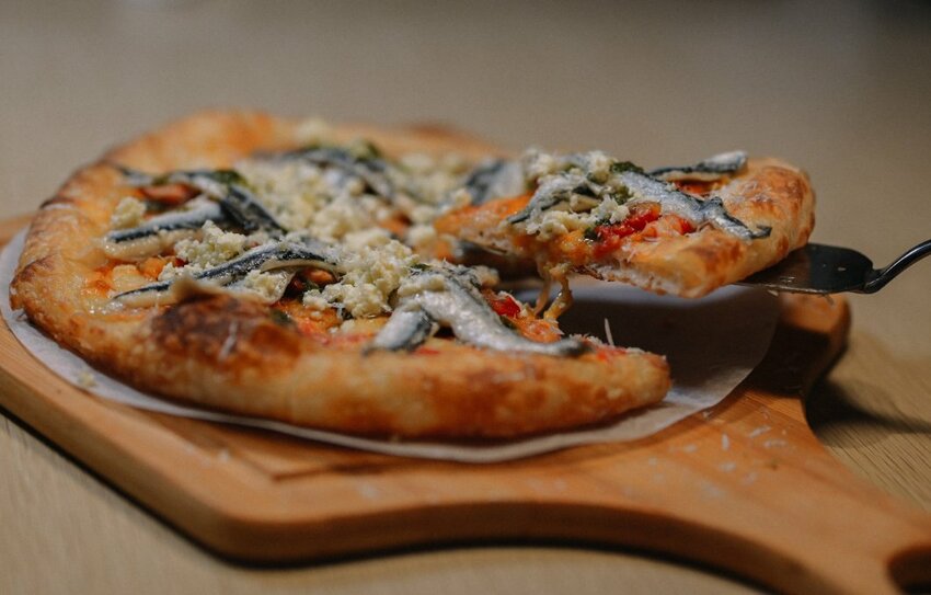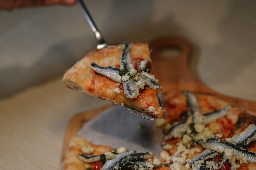 這道真的無敵特別,特製手工餅皮上塗抹番茄醬再鋪著一隻隻鯷魚與瑞克達起司.青醬點綴,看起來就創意十足!