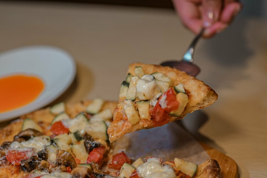 手揉自製餅皮上加上櫛瓜、香菇、蕃茄、起司、白醬、青醬等配料,看起來很簡單清爽!
