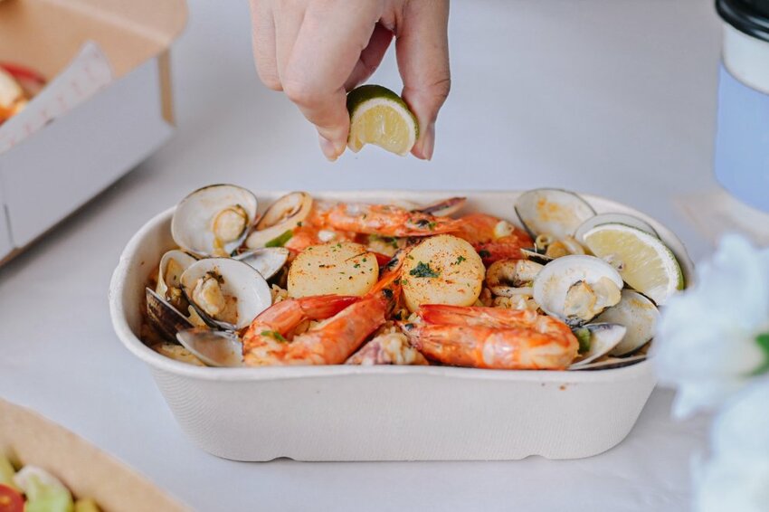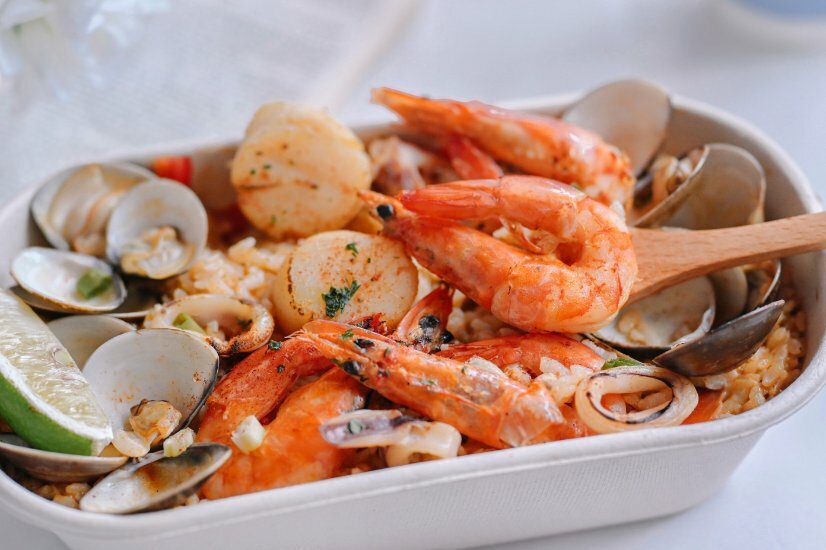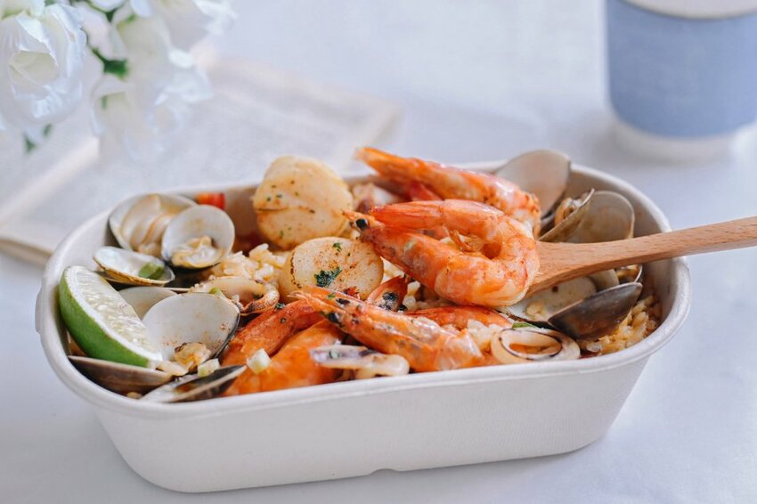 這餐點是兩人份量,餐盒內裝著干貝、新鮮小卷、 白蝦、蛤蜊,還附上兩片切片檸檬。