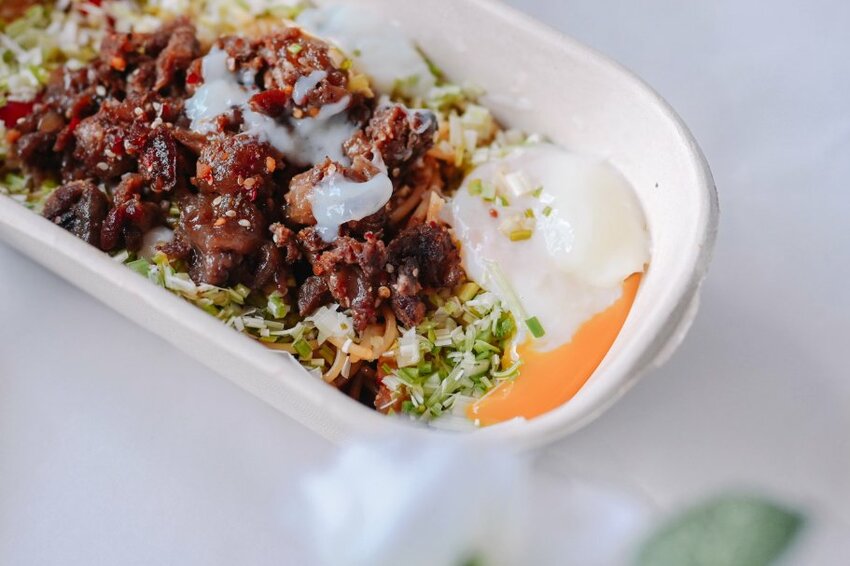 綠色的是台灣在地鮮蒜苗吃起來沒有蔥的嗆辣感,增加不少口感,而半熟蛋是給一整顆蛋自己剝進去,很考驗技術阿。