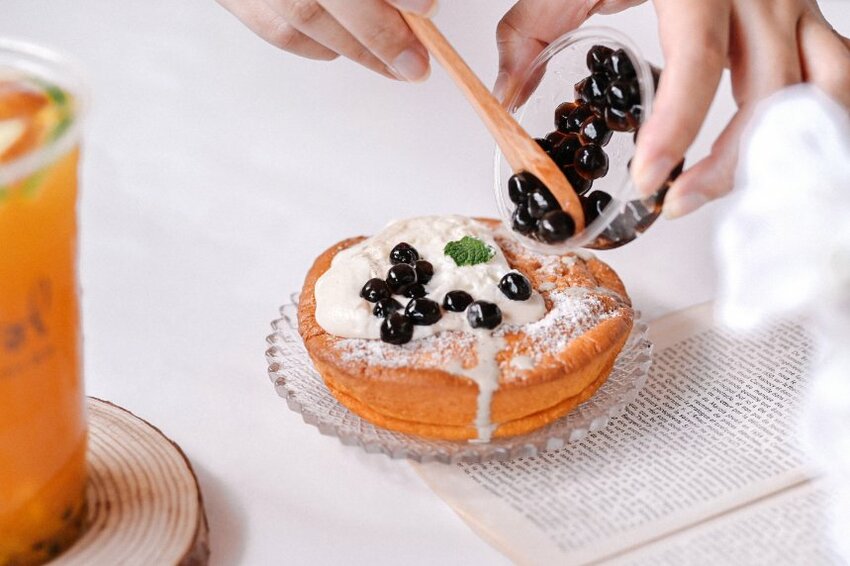 鐵觀音珍奶瓦帕鬆餅是獨家人氣熱賣款,附上鐵觀音奶霜、現煮珍珠粉圓 、馬斯卡彭起司餡切開的瞬間會緩緩流出,瓦帕鬆餅有點像舒芙蕾口感,綿密細緻,這份套餐裡面附上的是雲朵瓦帕鬆餅,SIZE比較小喔。