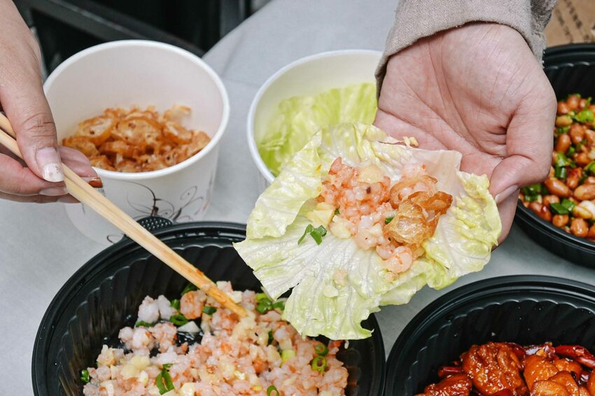 每一樣都有分開裝再自行組裝,先拿取一片生菜再放入適量的蝦鬆與油條,既清爽又有口感很適合這樣的夏天,但蝦卻缺少了鮮味。