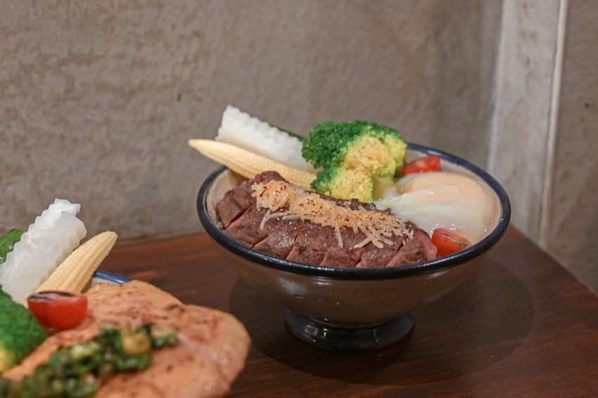 牛排也是經過舒肥法處理,色澤粉嫩,吃起來口感軟嫩富含肉汁,在嘴中咀嚼越咬越香,完全不塞牙縫,將軟嫩牛排沾上溫泉蛋液真是太誘人了,又是另外一種吃法與感受,正點!