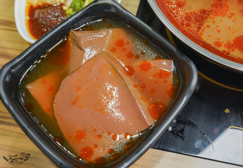 香麻夠味的「四川大紅袍麻辣鍋」,鍋底就有鴨血豆腐,很愛吃鴨血的我們又加點了一份,他們家的鴨血超讚的,連女兒也要夾2塊到上湯龍骨鍋涮煮一下搶食。