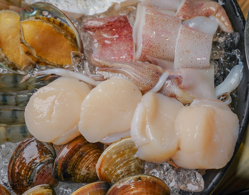 好浮誇的「豪華拼盤」,裡面有:帶殼鮑魚、鱸魚、蛤蜊、花枝、大鮮蝦、海草蝦、干貝,擺好擺滿、好霸氣,看了真教人心花怒放。