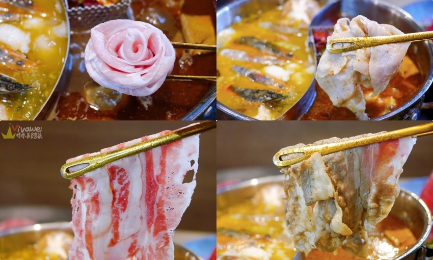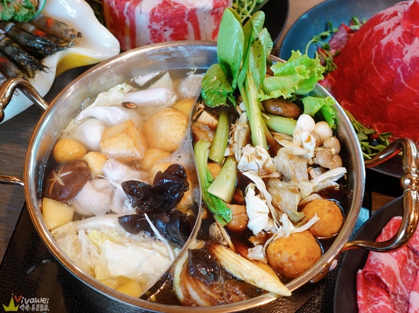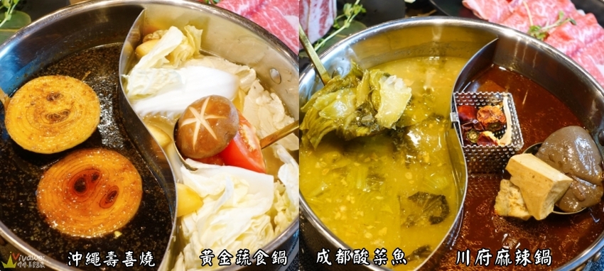 ▲鍋底有川府麻辣鍋、成都酸菜魚、沖繩壽喜燒及黃金蔬食鍋!