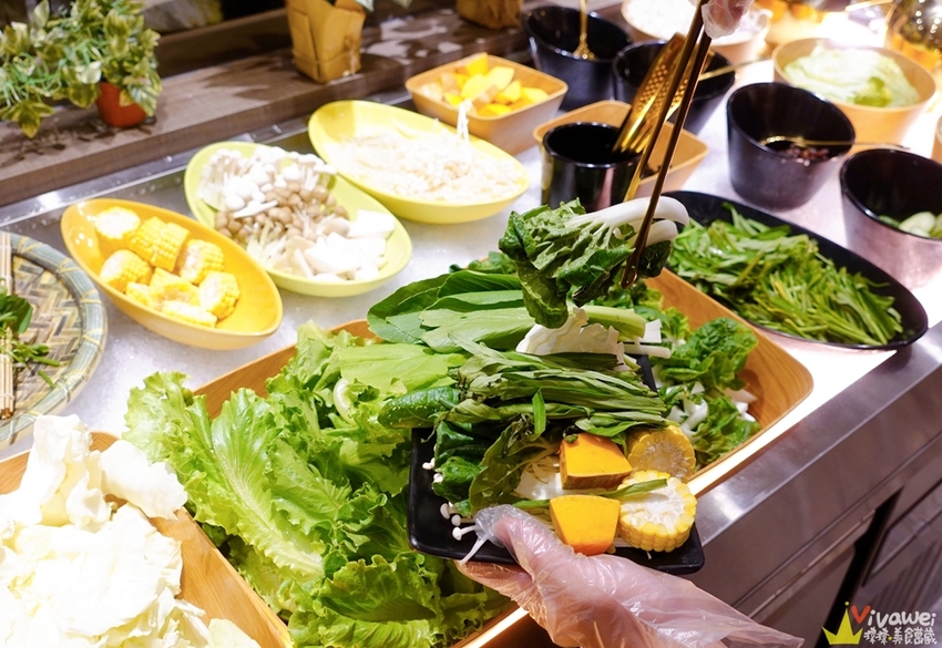 ▲超夯川的自助區非常豐富多樣!店家在一開始會端上一個固定的菜盤~但如果有另外想吃的青菜~都可以自行到自助區取用!