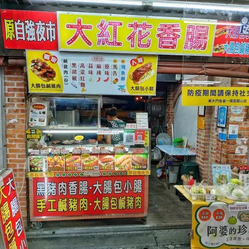 位在東大門夜市各省一條街的大紅花香腸,這間獨創的大腸包鹹豬肉,看到這個沒吃過,立馬來一份😋