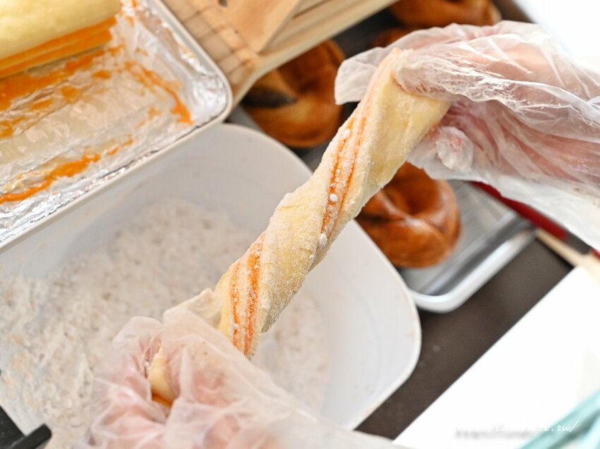 轉圈圈現烤甜甜圈的麵糰都要先發酵過,接著將麵糰旋轉成螺絲模樣,接著再轉圈下烤爐,糖糖第一次現場看丹麥甜甜圈烤的過程,還挺療癒的呢